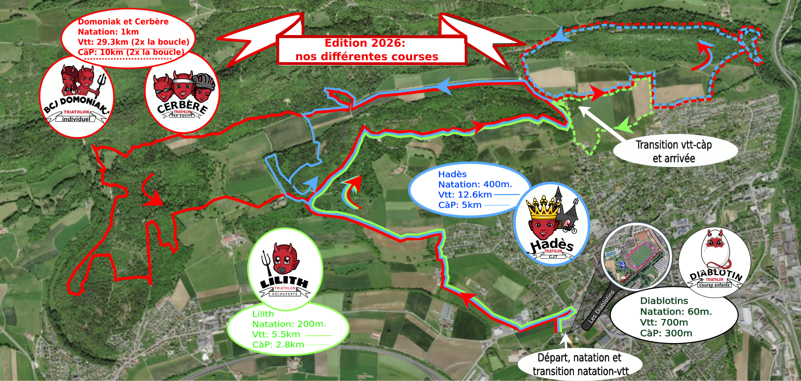 Am Nachmittag werden drei Strecken angeboten, die in La Blancherie beginnen und am Schießstand enden. Die Kurzstrecke (Lilith) ist für alle gedacht, die den Sport entdecken möchten (3JS für die Kategorien Minimes und Ecoliers). Die Mittelstrecke (Hadès) oder das Sprintformat (3JS für die Kategorien Kadetten, Junioren, Eliten, Senioren und Supersenioren). Die Langstrecke (Domoniak) oder das Standardformat ist für Einzelpersonen (3JS für Junioren, Eliten, Senioren und Supersenioren) oder für Teams (Cerbère) verfügbar, für alle, die eine Herausforderung zum Saisonabschluss suchen.